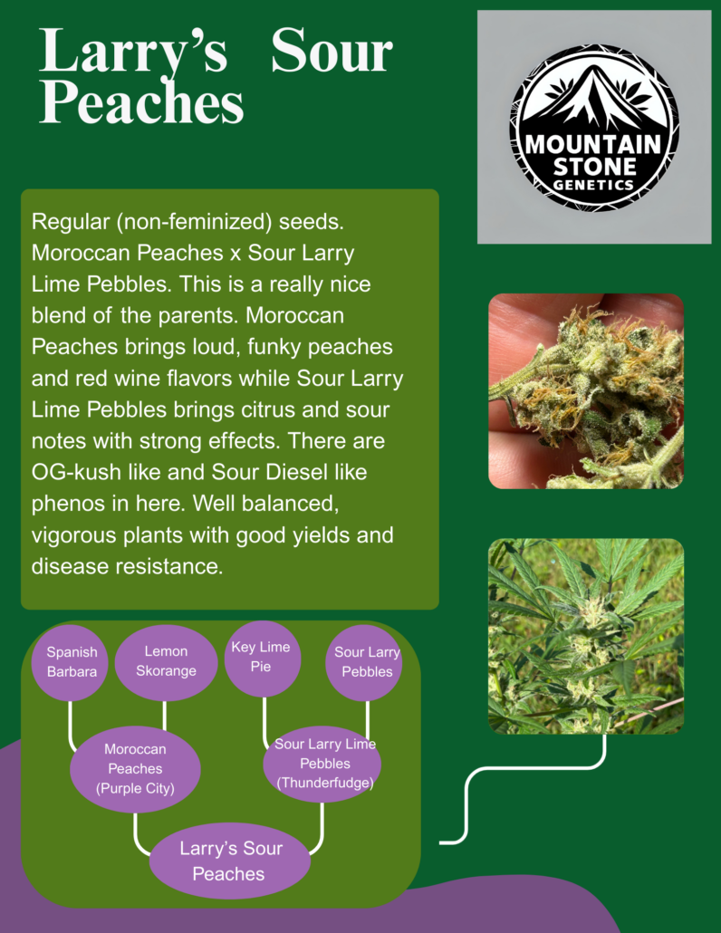 This is a really nice blend of the parents. Moroccan Peaches brings loud, funky peaches and red wine aromas while Sour Larry Lime Pebbles brings citrus and sour notes. There are OG-kush like and Sour Diesel like phenos in here. Well balanced, vigorous plants with good yields and disease resistance.