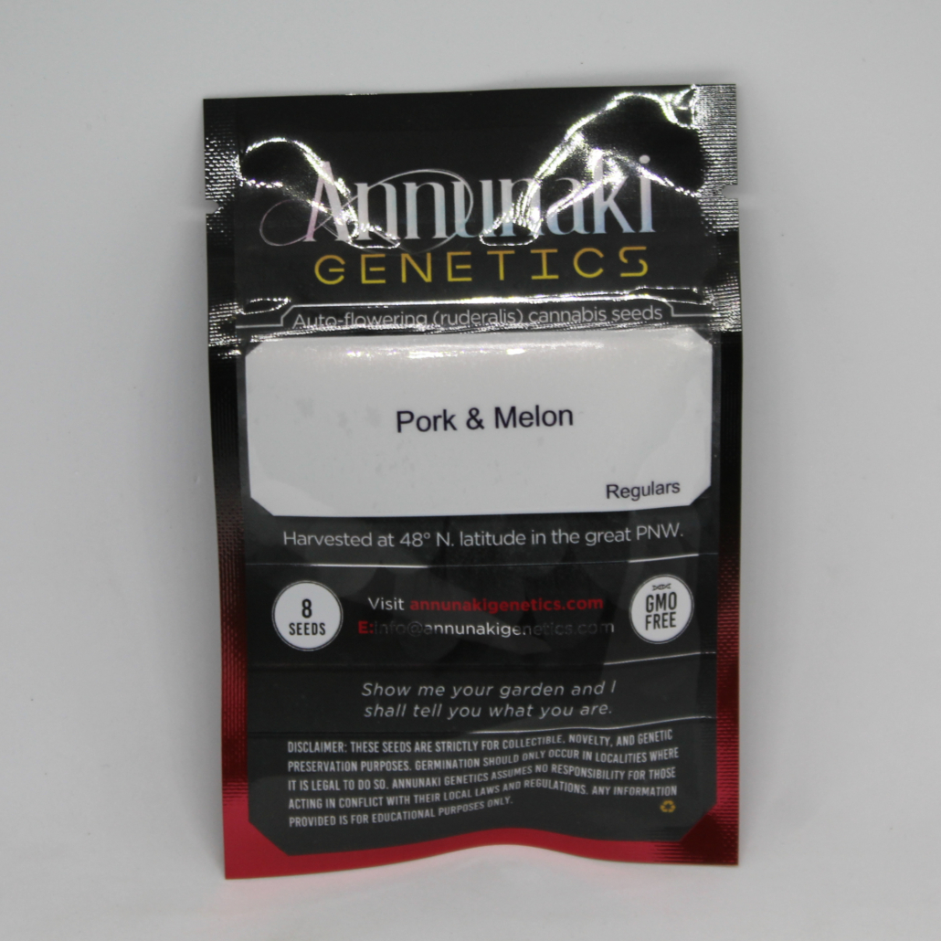 Pork & Melon plants are average size for ruderalis varieties and have solid green and purple-hued buds. The aroma is, as one might guess, a very unusual yet intriguing pork chops/cooked meat aroma with melon and grapes. This auto variety is potentially the most resinous of all the Annunaki autos released so far, and with fat buds, too!