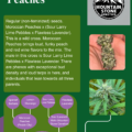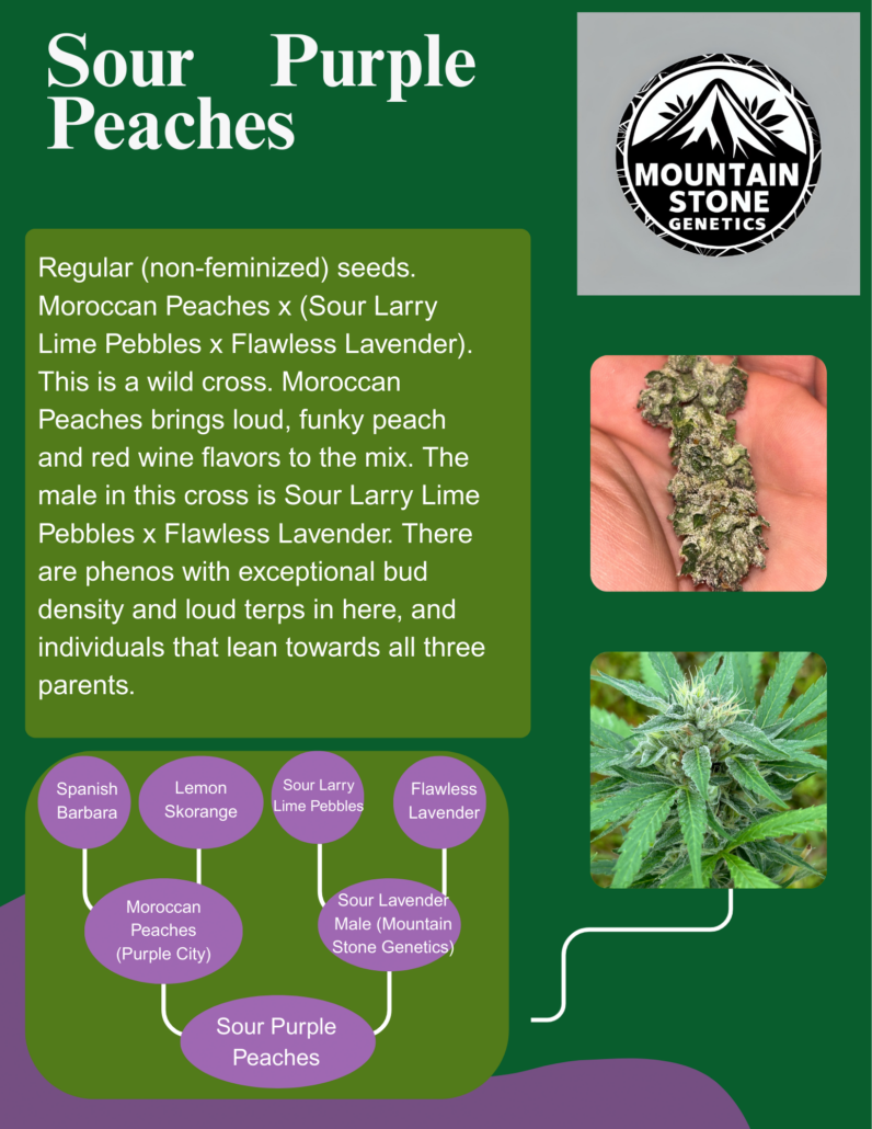 This is a wild cross. Moroccan Peaches brings loud, funky peach and red wine notes to the mix. The male in this cross is Sour Larry Lime Pebbles x Flawless Lavender. There are phenos with exceptional bud density and loud terps in here, and individuals that lean towards all three parents!