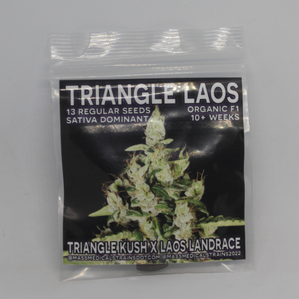 Notes: Triangle Laos takes things to new levels of possibilities. A true F1 with the legendary Triangle Kush and the Laos Landrace mixed with the TK brings about aromas of kush, spiced meat, metal, fine tobaccos and more make this an absolute gift to behold. Some flowers turn purple from the bottom up during the last few weeks of flowering. Stretch is vigorous, saving you time in veg, I recommend topping a few times and flowering it when it gets about 1 foot tall, for a 4-5 foot tall finished plant (grow dependent, you can shape them how you like if you want em smaller). Lots of interesting expressions to enjoy! Very sticky resin, even on the most sativa leaning phenotypes. Some phones are very dense and TK leaning too. Out of all of the Laos hybrids I created, this was easily one of the best.